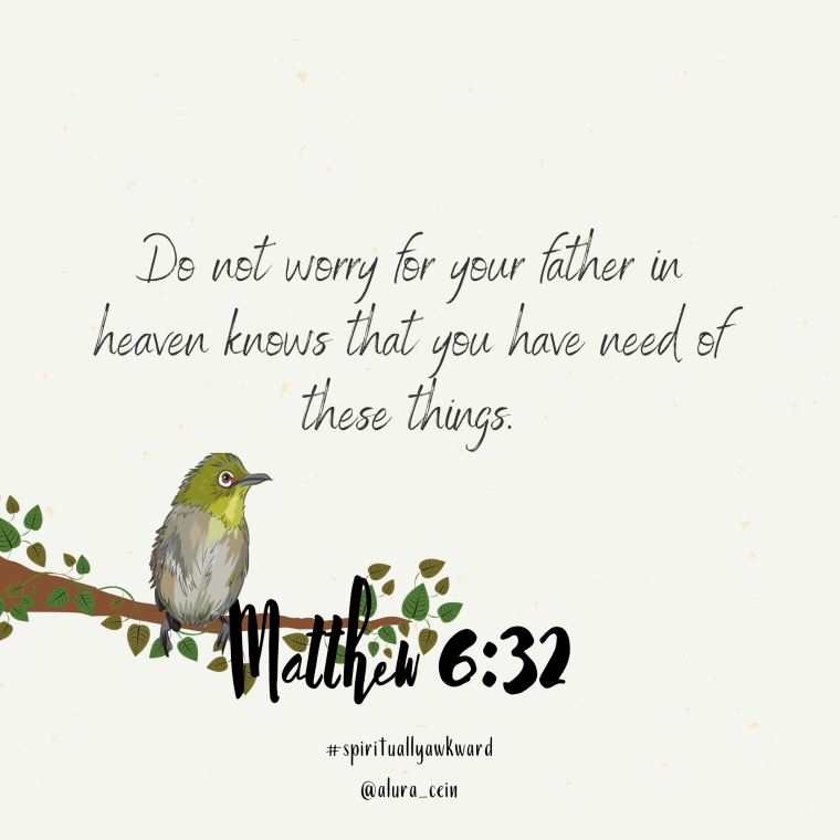 God did say after all, not to worry about what you’re going to eat, what you’re going to wear or where are you going to lay down your head. This is a very real quote to live by and while it goes far beyond this surface meaning here, adopting it as it is stated without further interpretation, can really do a world of change in your life in the way that you cope with stressful situations.